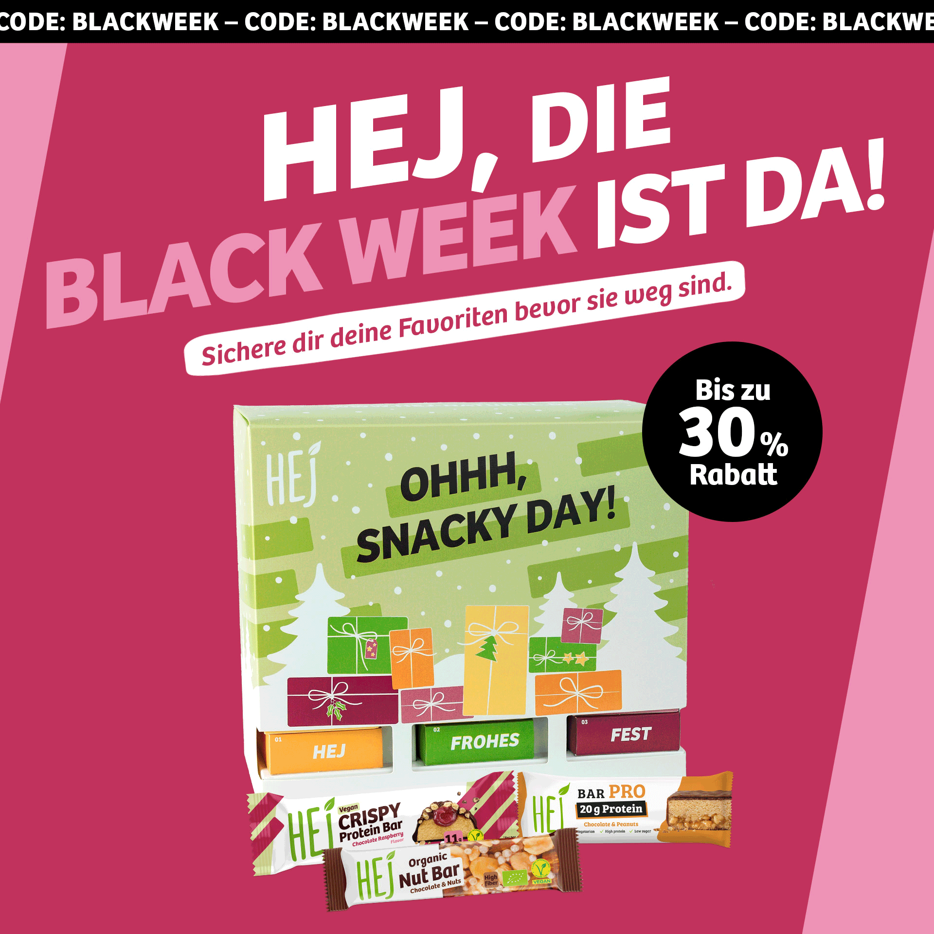 Hol dir deine liebsten HEJ Snacks, Proteinriegel und Essentials jetzt mit bis zu 30% Rabatt. Einfach Code BLACKWEEK im Checkout eingeben.
